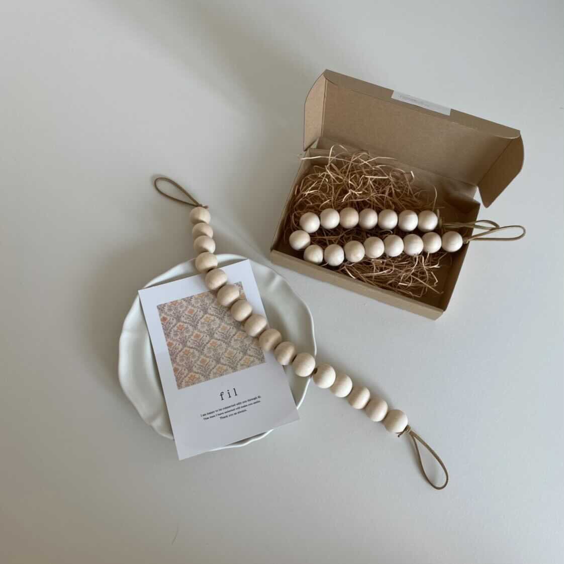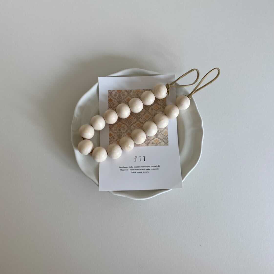 ウッドビーズ とスエードの紐を合わせた、カーテンホルダーです。
